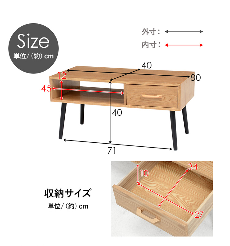 【本体サイズ・重量】 幅80:幅80×奥行40×高さ40cm (引出し)幅27×奥行34×深さ10cm (オープン部)幅45×奥行40×深さ12cm 重量 約10kg 幅100:幅100×奥行50×高さ40cm (引出し)幅35×奥行44×深さ10cm (オープン部)幅57×奥行40×深さ12cm 重量 約15kg 【材質】天板:天然木化粧繊維板(UV塗装) 脚部:樺材(ラッカー塗装) ◎組立式 ◎中国製