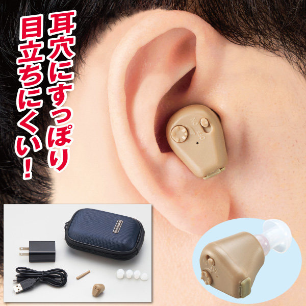 電池交換不要!便利な充電式集音器! 軽量化してリニューアル! 耳穴にすっぽり目立ちにくい! ●1回の充電で最大約20時間使用可能 ●音量調節可能 ●左右両用 ●軽量 ●集音器充電式 ●男女兼用 【セット内容】 ●収納ケース●受電口キャップ(予備)●ACアダプター●収納ケース●調節棒●USBケーブル●本体●イヤーキャップ(大×1・中×2・小×1)