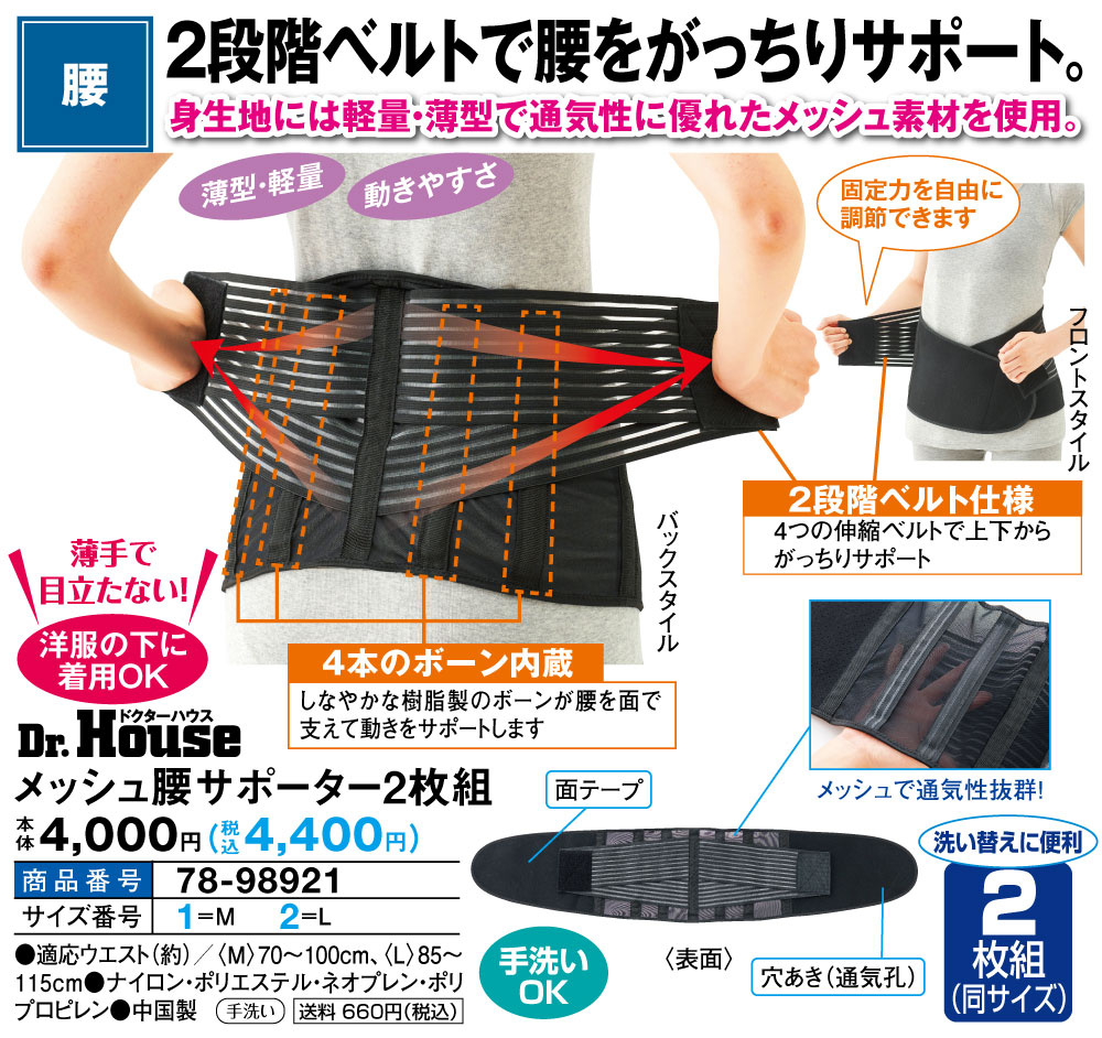 2段階ベルトで腰をがっちりサポート! 身生地には軽量・薄型で通気性に優れたメッシュ素材を使用。 メッシュで通気性抜群! 固定力を自由に調節できます ●薄型・軽量 ●動きやすさ ●2段階ベルト仕様 4つの伸縮ベルトで上下からがっちりサポート。 ●4本のボーン内蔵 しなやかな樹脂製のボーンが腰を面で支えて動きをサポートします。 薄手で目立たない! ●洋服の下に着用OK ●洗い替えに便利 ●2枚組(同サイズ)
